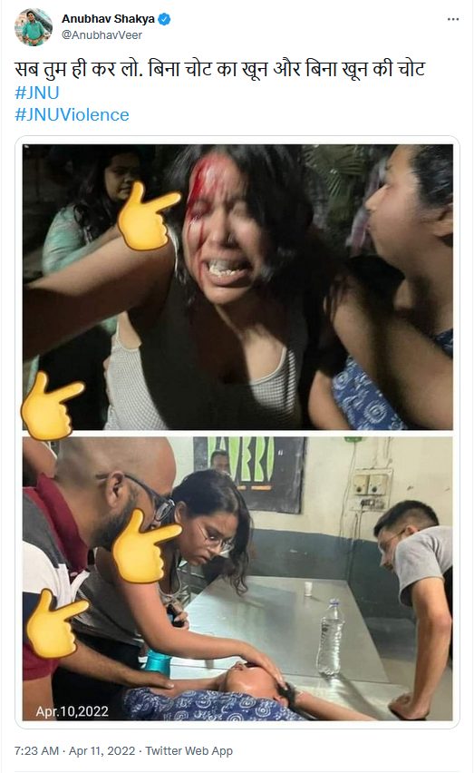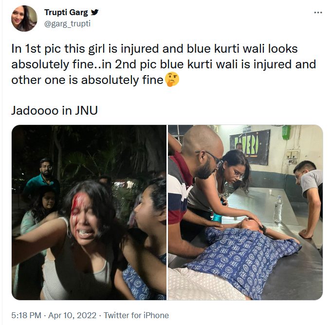 One Tripti Garg shared these photos to insinuate that the students "faked" their injuries. This is because, in the first picture, the woman who has a head injury can be spotted attending to the unconscious student in the second photo. She doesn't have a head injury in the second image. Gargi shared the pictures and wrote, "Magic in JNU". This tweet garnered around 13,000 likes as of this writing.